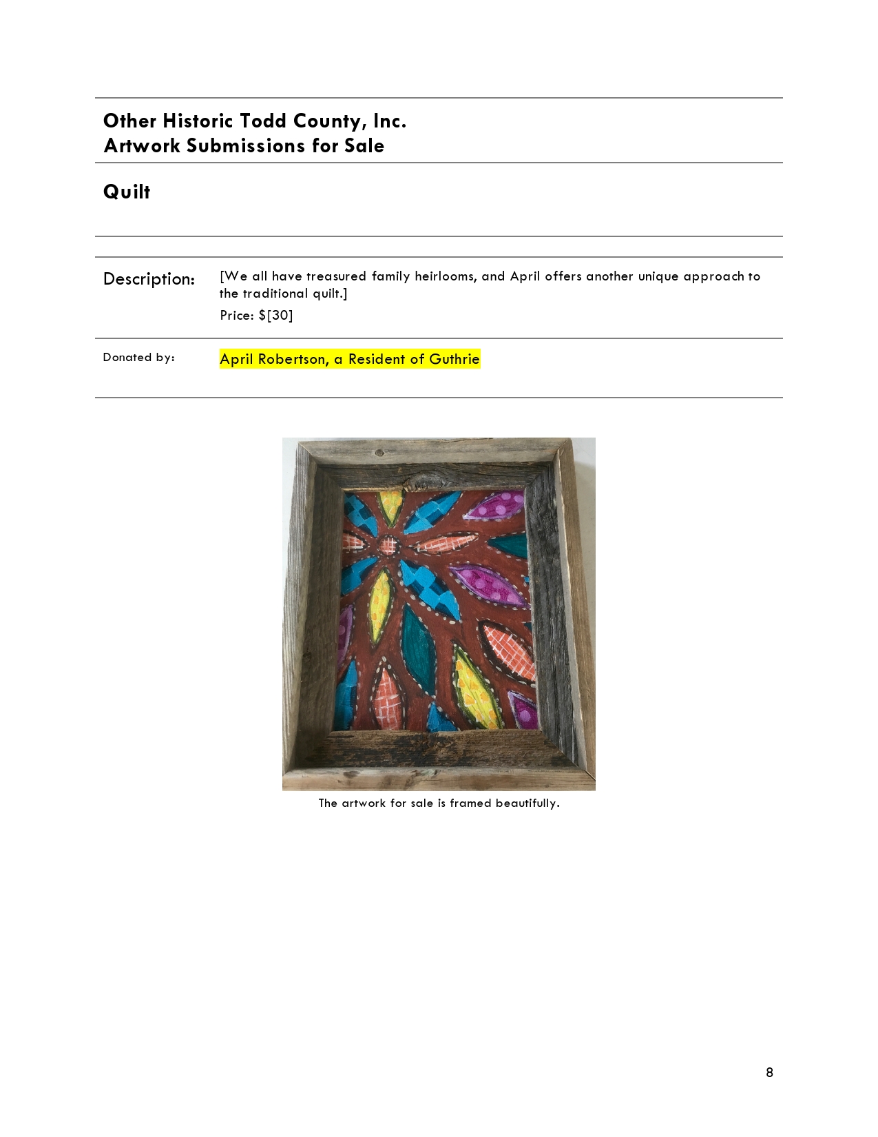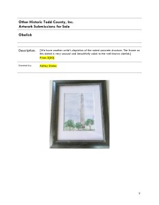 We are now down to five pieces of art to sell that were submitted for T Is for Todd County. Again, we appreciate the support we have been provided with our T Is for Todd County book project! Todd County can indeed be proud! Please share with others info about the remaining pieces that are now on display at the Welcome Center (1835 Courthouse). Pictured below are pics and explanations of the remaining pieces for sale through our efforts with T Is for Todd County. As the pieces sell, their pics will be removed. We ask you please share with others info about them. Please note we had to deal with lighting and the effects of taking the pics on a very busy schedule. If you click on a pic, you will see a bigger image. Christmas is just around the corner, and these art pieces will definitely bring smiles to recipients of all ages and professions. You will also be assisting us with generating monies for the rehabilitation of the second floor of the 1835 Courthouse!