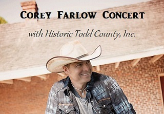 Historic Todd County, Inc. is excited to announce a fundraiser concert featuring Corey Farlow, Todd County’s own country music artist. The concert will be held on Saturday, March 2, 2019, from 7 pm to about 9 pm in the Todd County Central High School Auditorium at 806 South Main Street, Elkton, Kentucky. We hope you will join us for a fun night of family and Christian-based entertainment with all proceeds benefiting our efforts to rehabilitate the second floor of the Historic 1835 Courthouse.